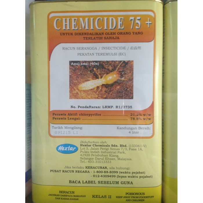 Insecticide / Racun Serangga (Anai-anai, semut) * Pest Control Chemical   Capacity: 4 Liter Active Ingredient: Chlorpyrifos 21.2% w/w Formulation: EC