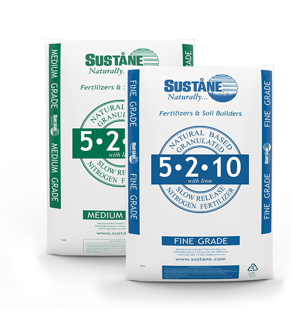 Sustane 5-2-10+Fe is the all-purpose turf food when the 1:2 N to K ratio is desired for building carbohydrate reserves in the root system. It is available in either Medium Grade (lawn and fairway applications) or Fine Grade for putting greens. Suitable for use on all turfgrass types providing quick green up followed by long-lasting slow-release organic nitrogen. Use where even growth and color are needed for six to eight weeks and potassium reserves need to be increased.