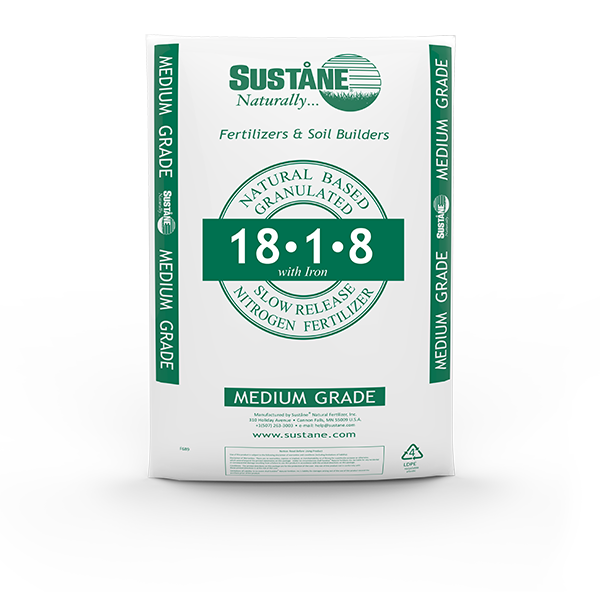 Suståne 18-1-8 with Iron is a two-part blend combining Suståne organic with urea nitrogen for enhanced and long-lasting color. The most economical coverage of any organic-based fertilizer. 12 - 16 week release rates.